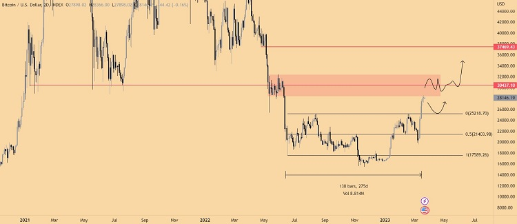 „Obecnie BTC dotarł do silnej strefy oporu, a mianowicie do strefy 28,5-32,5 tys. dolarów. BTC nie przejdzie przez to łatwo, więc dla wielu jest to logiczne miejsce do zabezpieczenia zysków” – napisali analitycy.