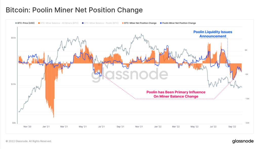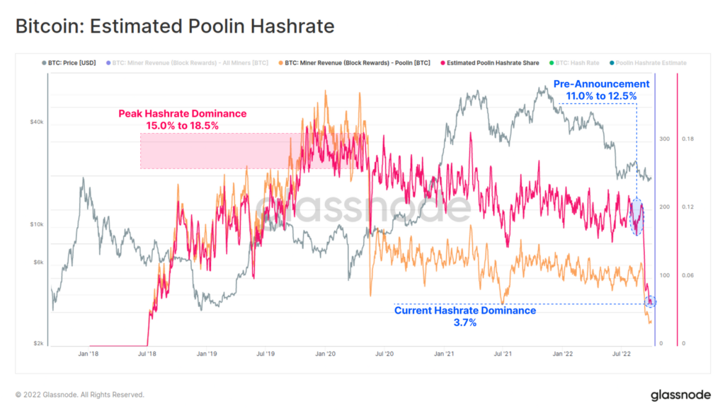 Do niedawna jeszcze chiński Poolin był jedną z największych puli wydobywczych Bitcoina. To ona odpowiadała za ponad 15% hashrate na początku 2020 roku i 12% na początku września tego roku. W obliczu problemów z płynością hashare spadł i stanowi dziś ok. 3,7% całkowitej mocy sieci przez co możemy zakładać, iż ze strony Poolin 'najgorszej’ już raczej za nami. Źródło: Glassnode