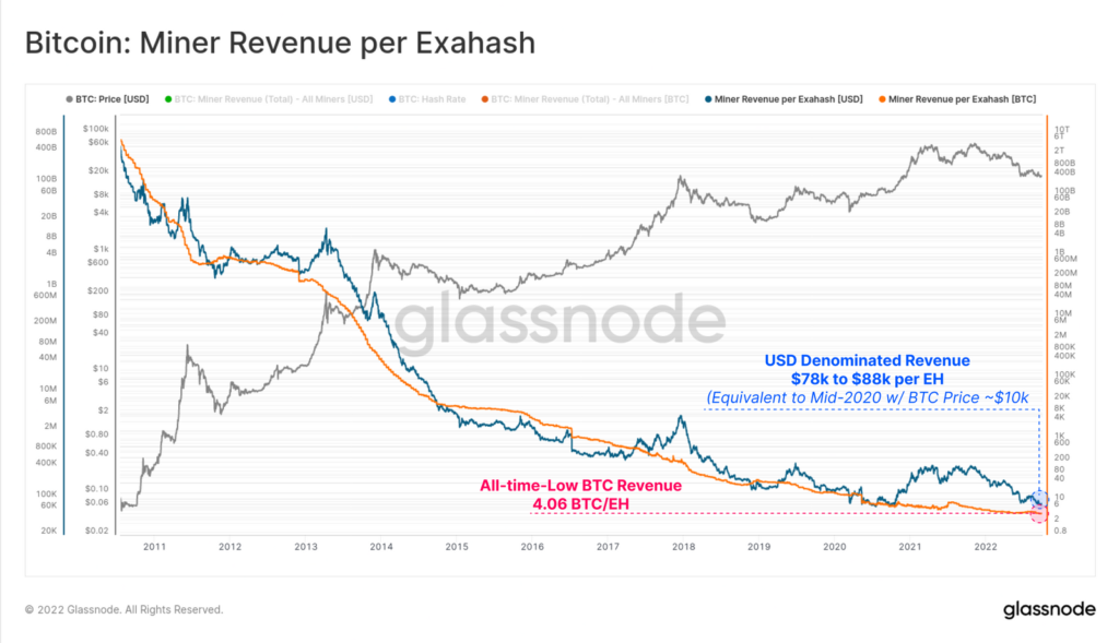 Metryka sprawiwa, iż Bitcoin zaczyna wyglądać nieco jak wehikuł czasu. Dochód górników w przeliczeniu na Exahash znajduje się w wieloletnim trendzie spadkowym. Denominowana w BTC nagroda wynosi dziś 4,06 BTC dziennie. Oznacza to ok 80 tys USD do wyjęcia dziennie na 1 Exahash. Jesteśmy zatem ponownie na poziomach z października 2020 roku czyli po poprzednim halvingu (maj 2020), gdy cena BTC wynosiła ok. 10 tys BSD. Dziś wynosi dwukrotnie więcej, a widoczny wzrost zarówno pod względem trudności wydobycia jak i mocy sieci odpowiada halvingowi (ograniczeniu o 50% zysku na hash). Źródło: Glassnode