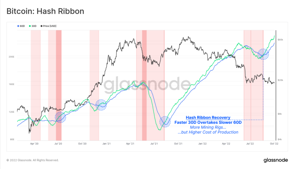 Wskaźnik Hash Ribbons odzwierciedla kondycję sieci Bitcoin i śledzi hashrate. Historycznie wskaźnik był jednym ze statystycznie skutecznie przewidujących zbliżające się odreagowanie. Wskaźnik rozpoczął powolne odbijanie od dna pod koniec sierpnia, co wskazywało wówczas na poprawę okoliczności dla górników. Ceny wciąż nie wróciły do normy, zatem wzrost hashrate wynika prawdopodobnie z coraz wydajniejszego sprzętu górników, który wpływa na wzrost mocy obliczeniowej (hashpower). Patrząc historycznie niemal zawsze poprawa kondycji hash ribbon zwiastowała wzrosty na rynku crypto (co nie znaczy, iż będzie tak zawsze). Na wykresie oznaczono momenty przecięcia się 30 i 60 dniowej średniej. Ostatnie przecięcie obserwowaliśmy na przełomie sierpnia i września, 30 dniowa średnia przecięła 60 dniową od dołu i wciąż znajduje się nad nią co do zasady jest pozytywne dla Bitcoina. Źródło: Glassnode