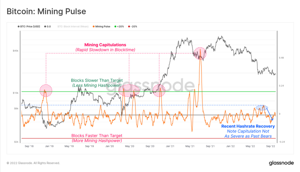 Wskaźnik Mining Pulse to narzędzie moitorujące aktywność górnikó Bitcoina. W tym celu metryka mierzy średni odstęp między zatwierdzanymi blokami (cel – 10 minut). Wartości niskie sugerują, iż bloki zatwierdzane w sieci są szybciej niż co 10 minut co wskazuje na rosnącą moc sieci (rosący hashrate). Wartości wyższe z kolei pokazują bloki zatwierdzane wolniej niż co 10 minut, co sygnalizuje na zwalniającą sieć. Wykres pokazuje, iż rynek górnikó doświadczył dłużej trwających problemów od maja 2021 roku, przy czym ożywienie zarejestrowano w sierpniu, tego roku. Poprzednie cykle Bitcoina kończyły się zawsze kapitulacją i co za tym idzie głębszmi spadkami hash rate. Nie jest wciąż jasne czy sytuacja w tej chwili oprze się spadkom jednak pewne jest iż w tej chwili większa część mocy sieci Bitcoin jest w posiadaniu często publicznych spółek górniczych co powinno sprzyjać większej transparentności. Źródło: Glassnode
