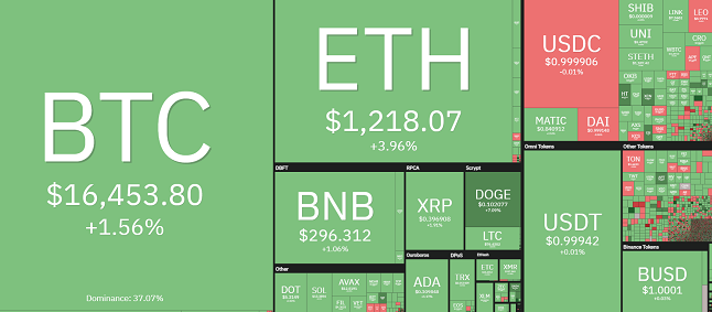 Dane z TradingView pokazują, iż bykom Bitcoina (BTC) udaje się udaremnić próbę niedźwiedzi, aby zbić BTC z powrotem poniżej wsparcia na poziomie 16 000 USD i podnieść jego cenę do południowego maksimum na poziomie 16 540 USD a dzisiaj do 17 000 USD.