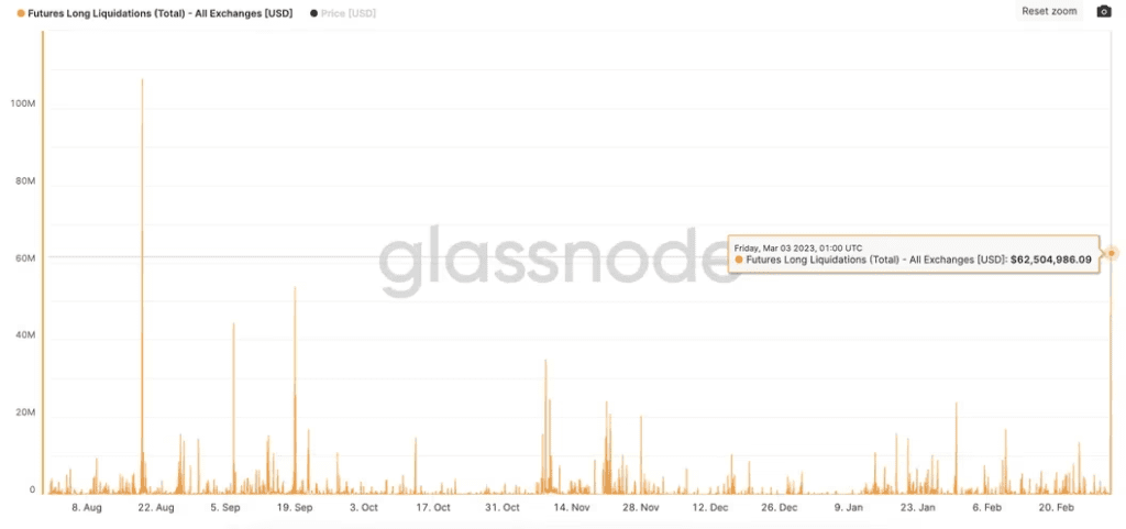 Źródło: GlassnodeW piątek likwidacje długich pozycji na BTC, spowodowane upadkiem banku Silvergate Capital były najwyższe od sierpnia 2022 roku. Ale czy pokieraszowane byki dadzą za wygraną? jeżeli historyczny pattern cenowy się powtórzy (oczywiście – esktrapolacja przyszłości na podstawie przeszłości zawsze jest ryzykowna) istnieje szansa, iż to strona popytowa ponownie zacznie przeważać. Co również interesujące – piątek dla Wall Street był bardzo udany – dla kryptowalut oczywiście był bardzo zły. Historycznie jednak gdy spojrzymy na sytuację z FTX, 'Bitcoin’ dorównał tempem do rozpoczętego na początku listopada wzrostu na giełdach (choć z opóźnieniem). Istnieje więć spora szansa, iż jeżeli giełdy będą kontynuowały odbicie, kwestia czasu dla BTC będzie ruch w górę.