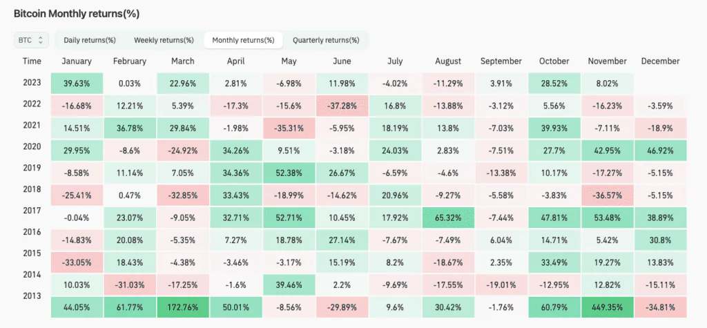 Analitycy techniczni wskazywali ostatnio, iż ok. 77% scenariuszu w takich formacjach skutkuje wybiciami w górę ale podaż przy 38,000 USD wydaje się bardzo silna, a nowy popyt nie jest w stanie jej 'wypełnić’. Grudzień dla Bitcoina zwykle był bardzo udany, z wyjątkiem 2013 roku gdy obserwowaliśmy blisko 35% korektę. W każym razie w grudniu 2021 i 2022 roku cena traciła odpowiednio 3,6 i 19%. Wzrosty w grudniu 2020 przekroczyły 46%. Warto podkreślić też, iż trudno traktować dotychczasową 'mapę’ sezonowości Bitcoina jako istotny wyznacznik momentum – dane są zbyt skromne.