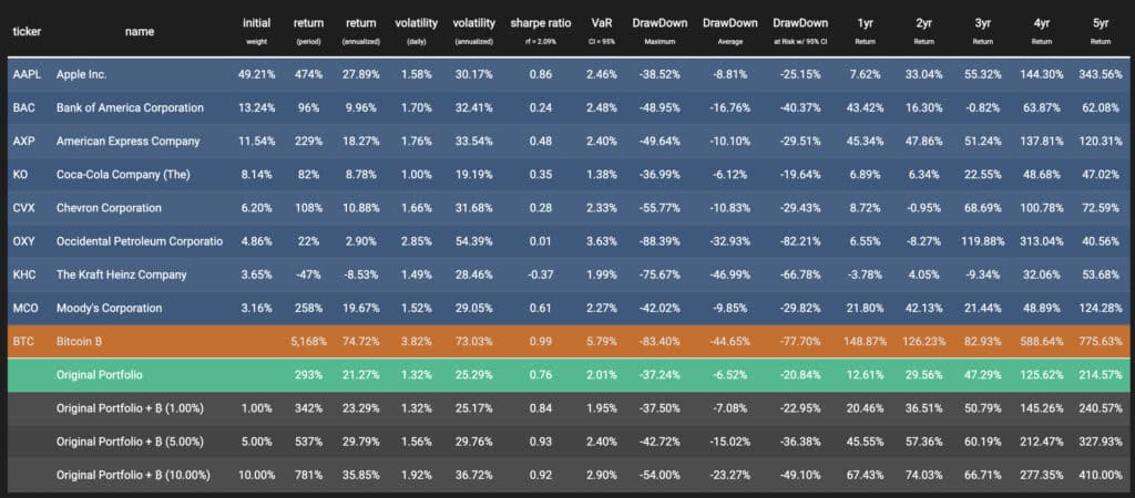 Niegdyś Buffett opisał Bitcoina jako „trutkę na szczury do kwadratu”. Tymczasem symulator Nakamoto Portfolio, sugeruje, iż dodanie tylko 1% Bitcoina do istniejącego portfela Berkshire, z jego głównymi udziałami w akcjach (m.in. Apple, Coca-Cola, Bank of America czy American Express) zwiększyłoby wzrost z 214% do 240% w 5-letnim horyzoncie czasowym. Ciekawiej zaczyna robić się, gdy % alokacji rośnie. I tak 5-10% portfela w BTC mogłaby przynieść Buffettowi zwroty na poziomie 328-410% w tym samym okresie. Kapitalizacja Bitcoina to ok. 1,4 bln USD.