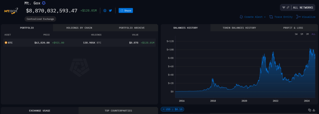 Najnowszy ruch giełdy został początkowo zidentyfikowany, gdy portfel powiązany z Mt. Gox przeniósł 0,02 BTC (niespełna 1.3 tys. USD) na adres docelowy, prawdopodobnie jako test transferu. Po tej niewielkiej transakcji nastąpił znaczący transfer 44 527 BTC (warte ok. 2,8 mld USD) do wewnętrznego portfela, zgodnie z danymi Arkham Intelligence. Na tym jednak nie koniec. Oto lista transakcji.