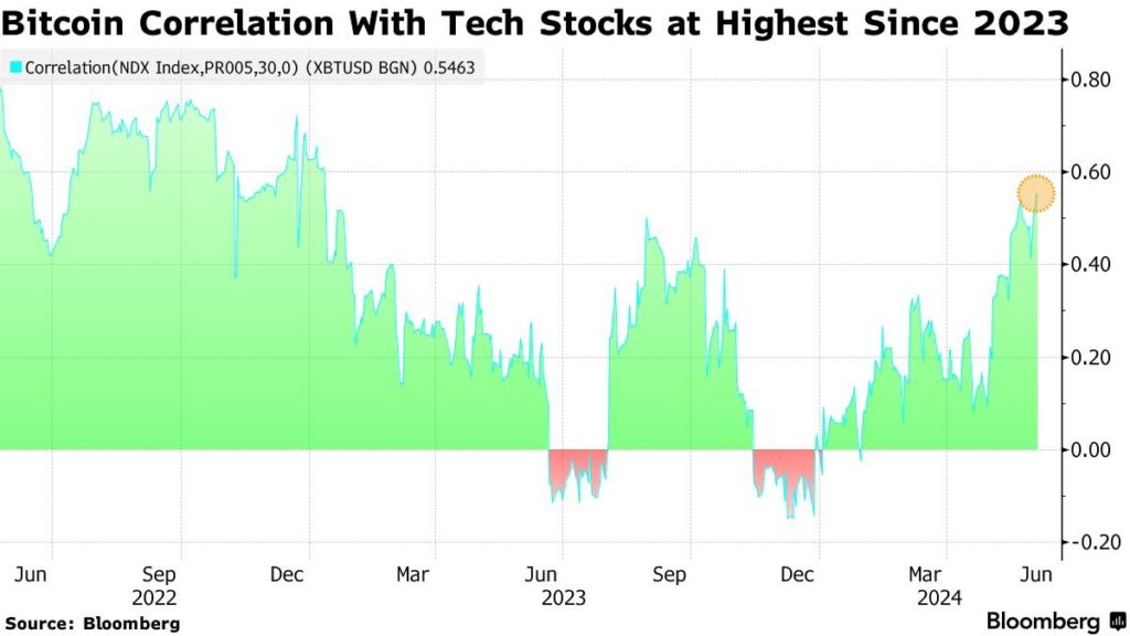 Korelacja BTC vs Nadsaq 100 rosnie od dluzszego czasu.