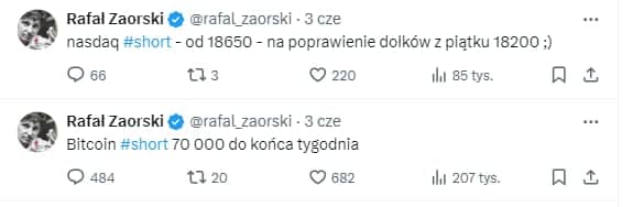 Znów niefortunnie o krótkich pozycjach na rynku BTC i Nasdaq 100 poinformował ostatnio, Rafał Zaorski. Od tego czasu zarówno kryptowaluty, jak i rynek akcji odrobiły straty. 'Król polskich spekulantów’ ponownie obserwuje straty w pozycjach. Ale bynajmniej nie składa broni. Wciąż poluje na krach.