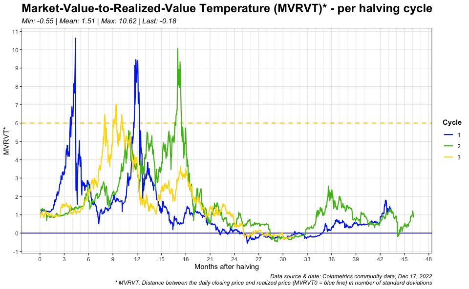 Wskaźnik analizy on-chain o nazwie Market Value to Realized Value Temperature (MVRVT) jest pochodną podstawowej metryki Market Value to Realized Value (MVRV). Definiuje się go jako stosunek kapitalizacji rynkowej do kapitalizacji zrealizowanej. Wskazuje ona jak daleko znajduje się cena Bitcoina powyżej lub poniżej tzw. „wartości godziwej” („fair value”, czerwona linia).