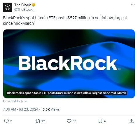 W ostatnim tygodniu cały rynek funduszy spotowych Bitcoina radził sobie nadspodziewanie dobrze. Wczoraj szczególnie wyróżniał się iShares Bitcoin Trust od Black Rock. IBIT. Największy fundusz notowany na giełdzie bitcoinów pod względem wartości aktywów netto, odnotował w poniedziałek napływ netto w wysokości 526,7 mln dolarów. To najlepszy wynik od 13 marca. To wynik godny uwagi ze względu na fakt, iż w tym momencie niemal wszyscy skupiają się na debiucie funduszy spotowych Ethereum ETF.
