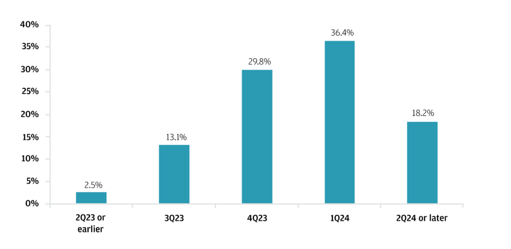 Ankietowani inwestorzy spodziewają się, iż Fed rozpocznie obniżki stóp w ostatnim kwartale 2023 lub na początku 2024 roku. Źródło: JP MorganNim przejdziemy dalej, nadmieńmy iż BlackRock ma zdecydowanie mniej optymistyczne prognozy. Ponieważ zakłada, iż Fed może w ogóle nie obniżyć stóp procentowych i nie rzucić Wall Street kapotu. To w połączeniu z recesją mogłoby doprowadzić rynki do rezygnacji i krachu, w miarę jak inwestorzy zorientowaliby się, iż utknęli w sytuacji 'bez wyjścia’ ze spadajacymi zyskami giełdowych spółek i Rezerwą Federalną wciąż utrzymującą wysokie stopy procentowe. O tym wspomnimy niżej.