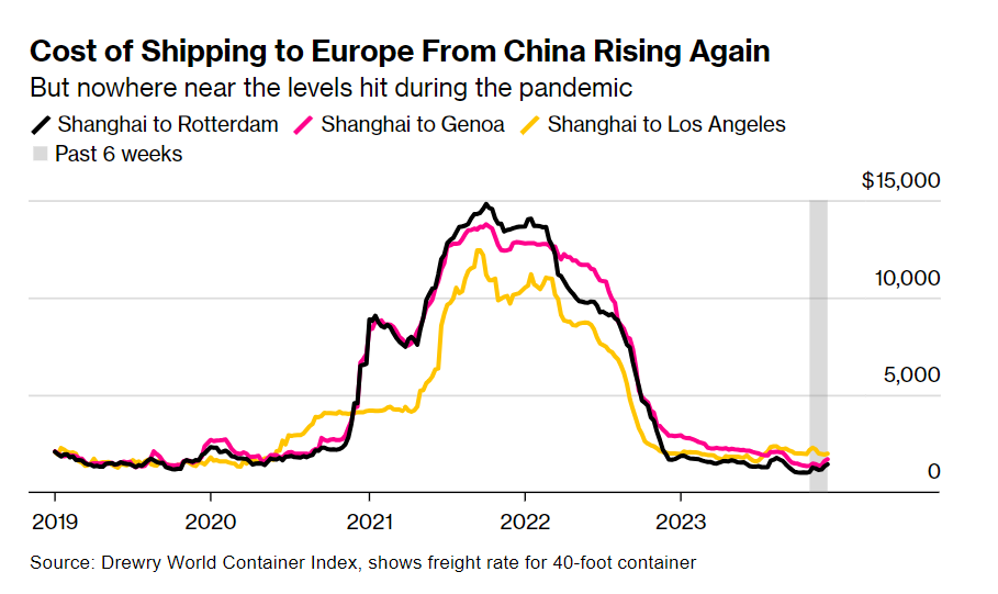 Podczas gdy koszt wysłania 40-stopowego kontenera z Szanghaju do Rotterdamu wzrósł o 44% od końca października przed rozpoczęciem ataków i o ponad 26% do Genui, pozostają one znacznie poniżej poziomów w 2021 i 2022 roku podczas pandemii, pokazują dane zebrane przez Bloomberga.Koszty wysyłki do Europy z Chin ponownie rosną ale nie są choćby zbliżone do okresu pandemii. Drewry World Container Index, pokazuje stawkę frachtową standardowego kontenera 40ft.