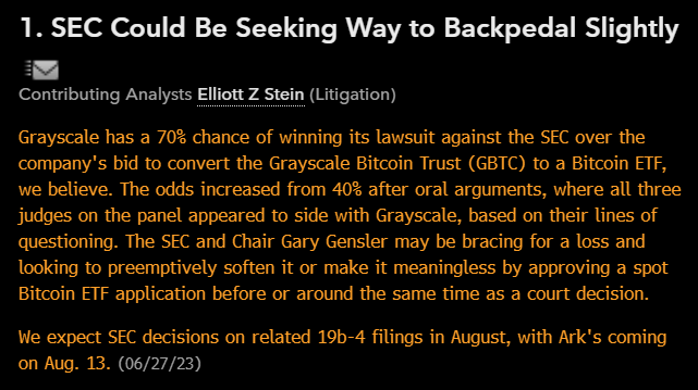Według Elliotta Z. Steina, czołowego analityka procesowego w Bloomberg Intelligence, Grayscale ma 70% szans na wygranie procesu przeciwko SEC. Stein szacuje, iż SEC zostanie finalnie zmuszony do zatwierdzenia wniosku o ETF. Jeszcze przed wydaniem decyzji przez sąd w sierpniu 2023 r., czyli w tym samym czasie, w którym oczekuje się na decyzję Ark Investment Management w sprawie zatwierdzenia ETF. Po tym, jak amerykańska SEC odrzuciła wniosek Grayscale w czerwcu 2023 r., Ark nie tracił czasu w złożenie pozwu kwestionującego tę decyzję.