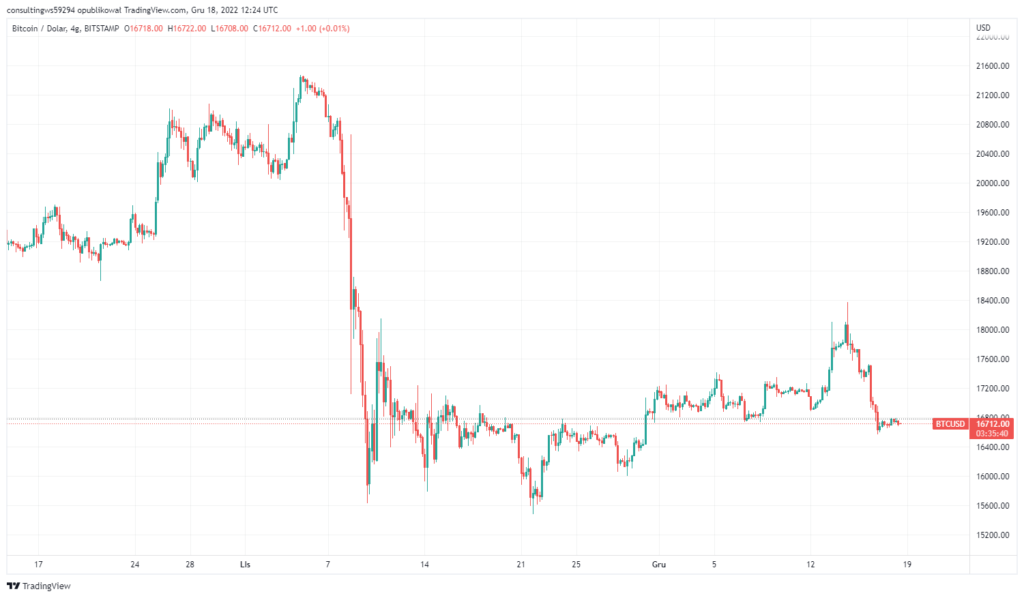16 grudnia po otwarciu Wall Street Bitcoin pozostawił wsparcie na okrągłym poziomie 17000 USD i zaczął podążać za akcjami, które w Stanach Zjednoczonych spadały po przetrawieniu przez rynek podwyżki stóp Fed i „jastrzębich” komentarzy Powella.