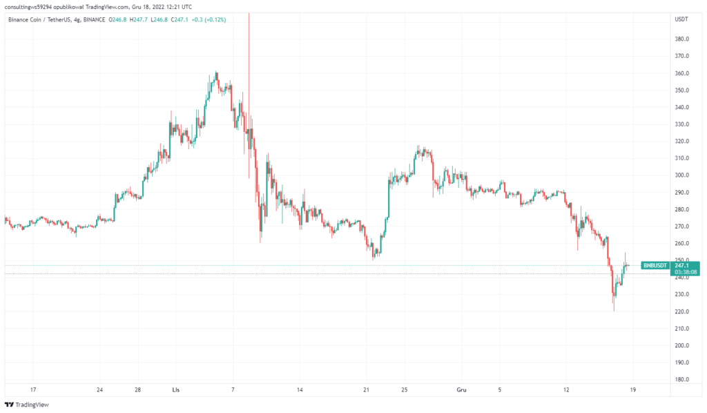 BNB/USD spadł w ciągu dnia do blisko 220 USD, osiągając najniższe poziomy od lipca.