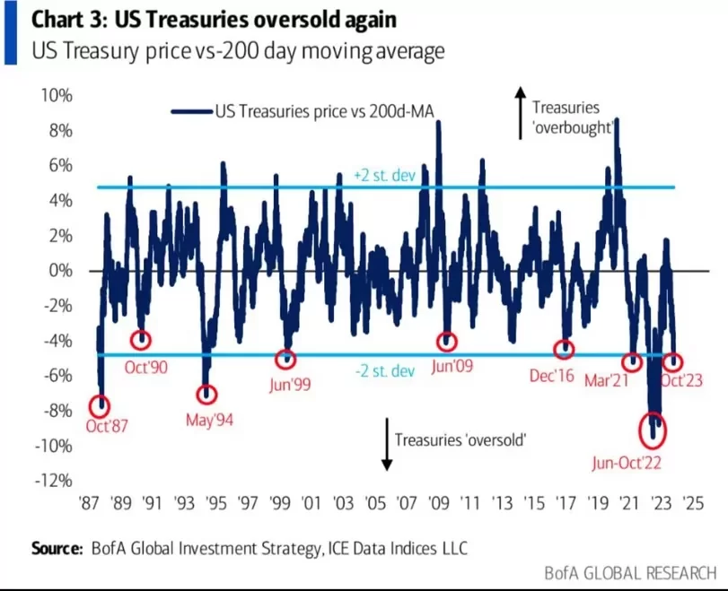 Według dokładnej analizy Bank of America Securities, historycznie wyprzedane poziomy skarbowych obligacji Stanów Zjednoczonych poprzedzały poważne eksplozje zmienności (eng. 'volatility spikes’) wśród różnych sektorów rynków – od walut po Bitcoina. W nocie czytamy, „Wyprzedane obligacje: Obligacje skarbowe notowane są ponad 5% poniżej średniej 200 DMA. Należy zauważyć, iż wszystkie wyprzedaże zbiegły się w czasie / zapowiadały różnego rodzaju istotne wydarzenia: