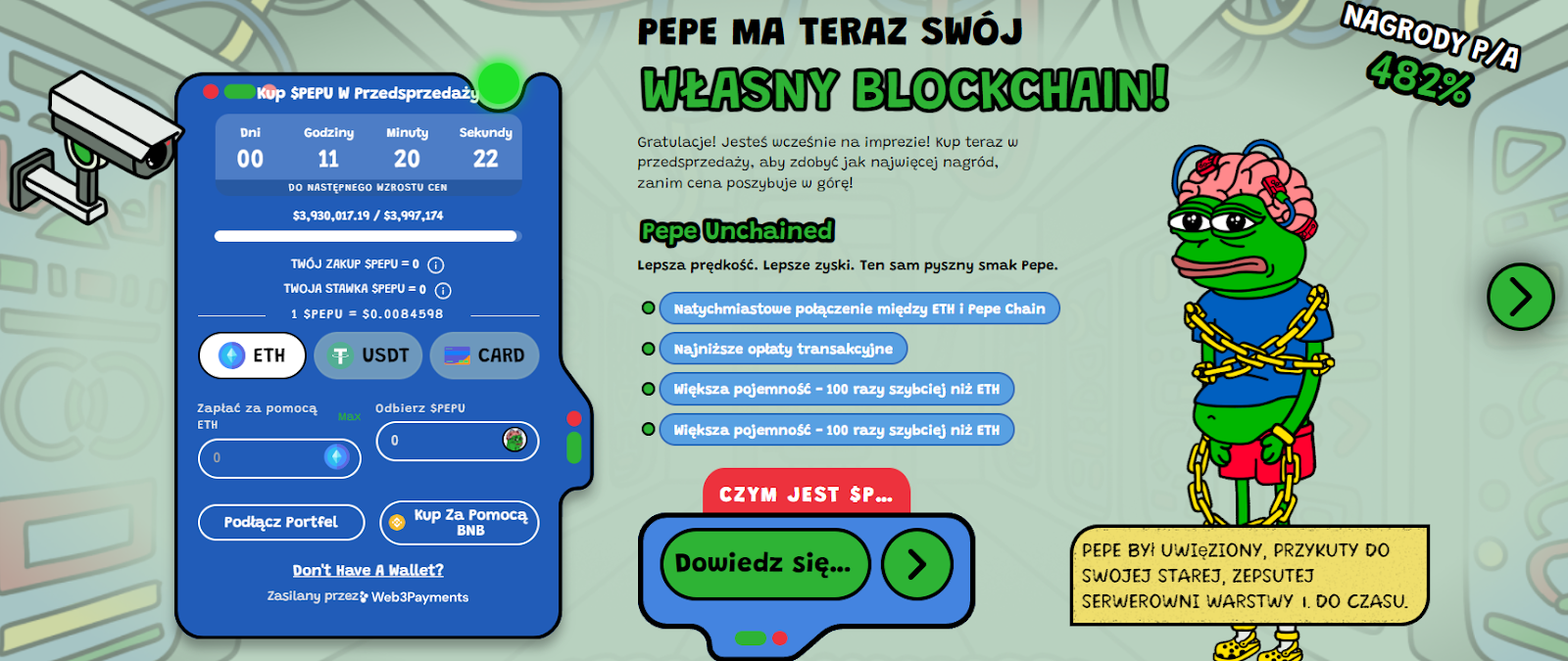 Dołącz w przedsprzedaży do Pepe Unchained pierwszego na świecie tokena na własnym łańcuchu. Odwiedź stronę Pepe Unchained, podłącz swój portfel i wymień $PEPU na ETH, USDT lub BNB, albo użyj karty kredytowej i zgarnij $PEPU w niesamowitej cenie!