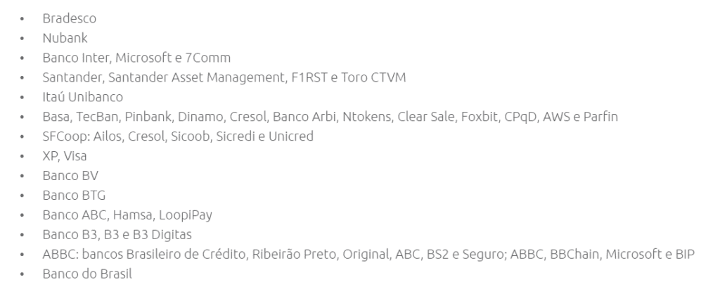 W tej liczbie znalazły się wiodące brazylijskie banki – jak państwowy Banco do Brasil oraz prywatne Itaú Unibanco i Bradesco, tutejszą giełdę akcji – B3, a także zagranicznych graczy na rynku finansowym – jak Santander czy Visa. Listę uzupełniają także zaangażowane w projekt firmy Microsoft i 7COMm.