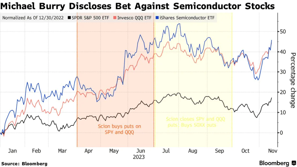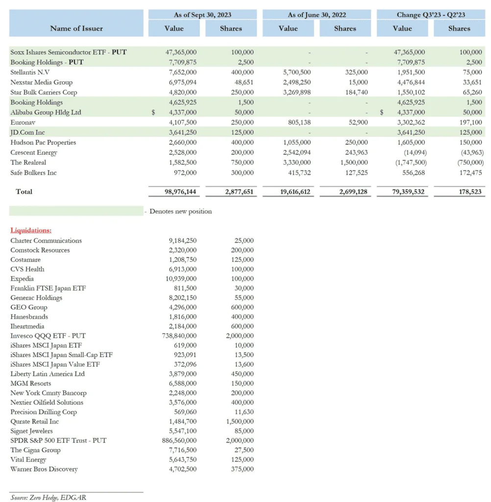 Scion Asset Management zlikwidował pozycje na blisko 24 akcjach i funduszach ETF, zgodnie z dokumentem złożonym w SEC (13-F). W ramach rebalansu firma postawiła na niedźwiedzią pozycję opcyjną przeciwko funduszowi, który śledzi akcje producentów układów scalonych. Jej wartość nominalna wynosi 47,4 miliona dolarów (w oparciu o cenę zamknięcia funduszu iShares Semiconductor na dzień 30 września). Rzeczywista wartość pozycji opcji jest oczywiście niższa i zależy od kontraktów, które zostały zakupione.