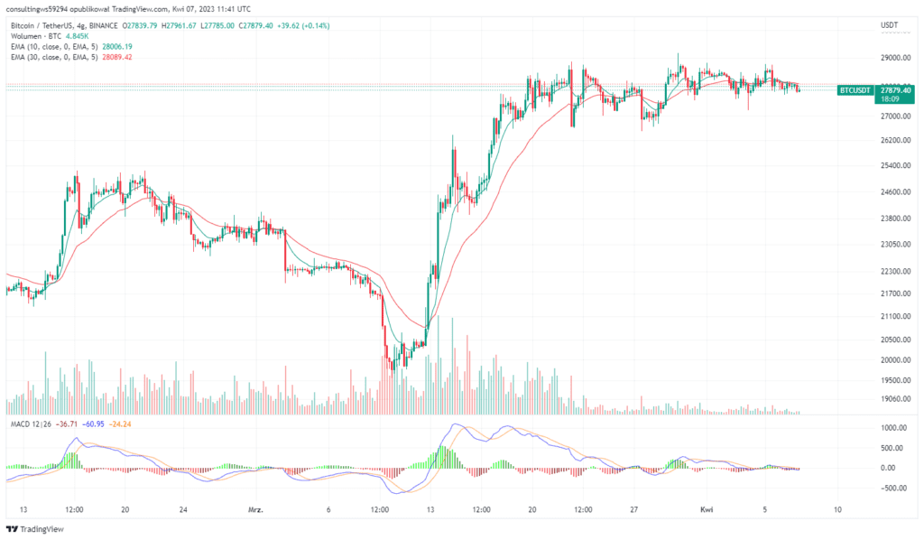 Jeśli chodzi o Bitcoina, dane dostarczone przez TradingView pokazują, iż niedźwiedzie podjęły kolejną próbę przełamania wsparcia na poziomie 28 000 USD. Jednak byki skutecznie poradziły sobie ze słabymi misiami. Po krótkim spadku do dziennego minimum na poziomie 27 738 USD, kurs BTC powrócił z powrotem powyżej 28 100 USD.