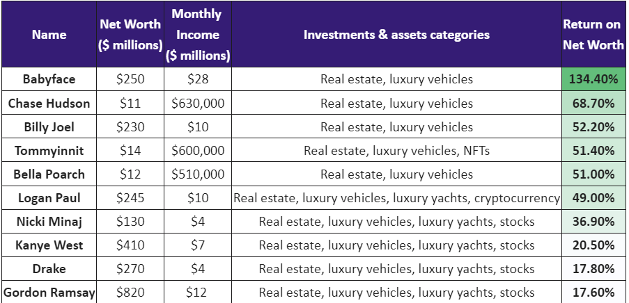 Celebryci wykazali zamiłowanie do inwestowania głównie w luksusowe pojazdy, nieruchomości i coraz częściej w kryptowaluty. Średnia lokata kapitału znanego nazwiska wynosi około 38 milionów dolarów, a niektóre z nich przekraczają 100 mln USD w pojedynczych inwestycjach.
