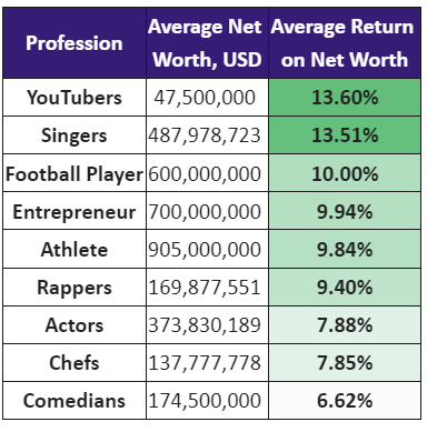 Na szczycie listy pod względem ROI znajdują się… YouTuberzy. Osiągają oni sumarycznie największe stopy zwrotu (13,6%) w zestawieniu z innymi przedstawicielami branży rozrywkowej. Co ciekawe, mają oni jednocześnie najniższą „wartość netto” wynoszącą 47,5 milionów dolarów amerykańskich – jest to miara którą oznacza się wycenę aktywów posiadanych przez daną osobę oraz samą wartość jej pracy i wizerunku. Na drugim miejscu są piosenkarze, którzy mają co prawda ROI niemal identyczne co twórcy na YT (13,51%), natomiast zarazem ponad dziesięciokrotnie większą „net worth”.