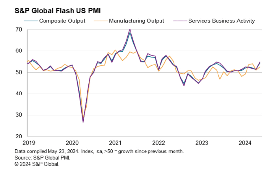 Publikowane dziś wstępne dane S&P PMI ze Stanów Zjednoczonych za maj okazały się znacznie mocniejsze, niż powszechnie oczekiwano. Teoretycznie nie powinno to być powodem strachu na rynkach, ale teorię zostawmy na bok. Zarówno PMI usług, przemysłu jak i wskaźnik zbiorczy zaskoczyły w górę.