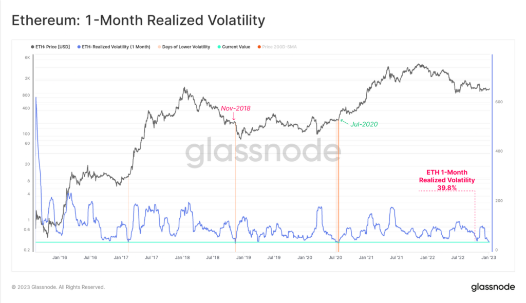 Gdy popatrzymy na Ethereum zobaczymy, iż dla tej kryptowaluty jest oczywiście jeszcze mniej tak niskich okresów zmienności, w których miesięczna zrealizowana zmienność spadła do prawie 40%. Wszystkie poprzednie sytuacji podobnie małej zmienności poprzedzały ekstremalny jej skok:Listopad 2018 skończył się 58% spadkiem