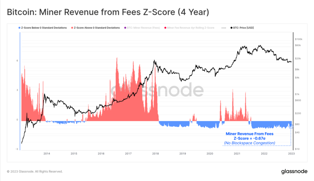 Górnicy Bitcoina wciąż znajdują się pod presją, a popyt na przestrzeń blokową Bitcoin wciąż maleje, z widoczną niewielką presją wzrostową na rynku opłat. 4-letni wskaźnik Z-Score przychodów górników Bitcoina nie potwierdził żadnych istotnych kroków w kierunku pozytywnego terytorium i pozostaje na poziomach w okolicach -0,67 odchylenia poniżej średniej. Wykres pokazuje 4-letni Z-Score, korzystając z funkcji średniej ruchomej SMA i odchylenia standardowego. Źródło: Glassnode