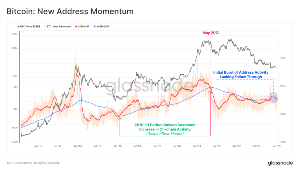 Przesuwając uwagę na kluczową dla rozwoju sieci Bitcoina aktywność on-chain, możemy zobaczyć, iż krótkoterminowy wybuch nowych adresów BTC nastąpił po upadku FTX, ale od tego czasu wyraźnie się ochłodził. Miesięczna średnia nowych adresów (czerwony) powraca w kierunku rocznej średniej bazowej (niebieski). Pokazuje to jednoznacznie, iż wykorzystanie sieci musi jeszcze ustanowić przekonujące i trwałe ożywienie, które nie nastąpiło. Momentum aktywności on-chain jest potężnym narzędziem do monitorowania ożywienia w podstawach sieci, a okres z 2019 i 2020 roku jest kluczowym przykładem z przeszłości. Potencjalny spadek nowych adresów poniżej miesięcznej średniej ruchomej w okolicach 405 tys. dziennie może potwierdzić spadkowe momentum. Źródło: Glassnode