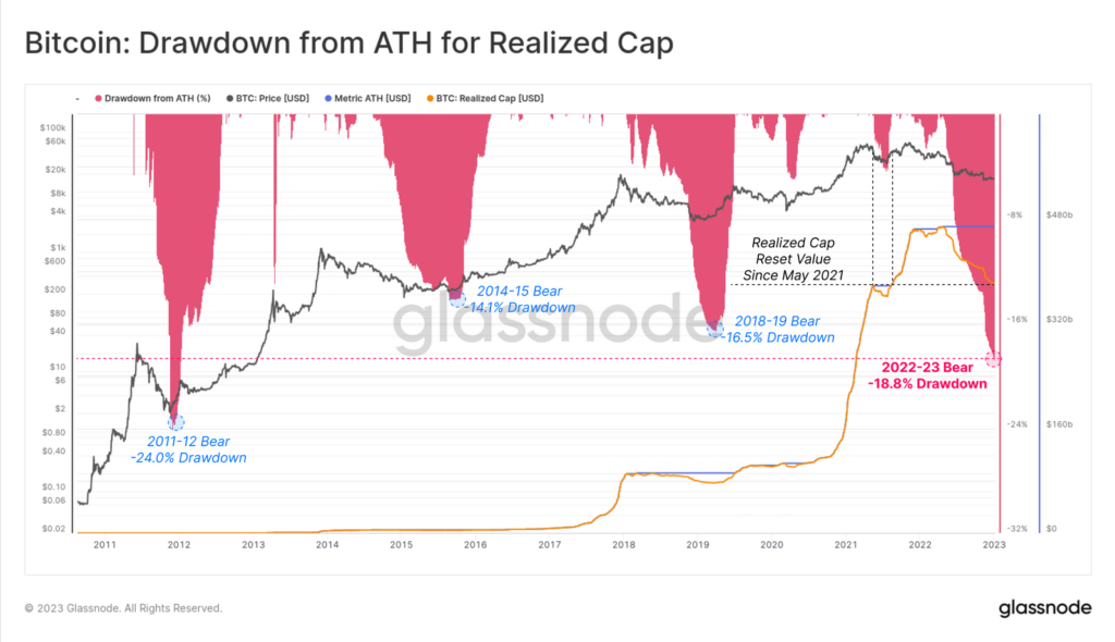 Aktywność on-chain sieci Bitcoin jest mizerna, a liczby nowych adresów które historycznie zwiastowały pozytywne momentum spadają. Jej chwilowy wzrost okazał się efektem upadku FTX (zainteresowanie kluczami prywatnymi spowodowane strachem), wskazując na wciąż niższe zainteresowanie siecią BTC. Sytuacja na rynku górniczym nie pokazuje wystarczająco istotnej poprawy co tworzy ryzyko, iż minerzy wciąż będą skłonni upłynniać zasoby. Wskaźnik zrealizowanej kapitalizacji nie wymazał całkowicie wzrostów z 2020 i 2021 roku, jedynie z drugiej połowy 2021. Jedne z kluczowych metryk on-chain nie potwierdzają szans na utrzymanie momentum byka (co ostatecznie oczywiście nie przesądza o możliwości jego utrzymania).