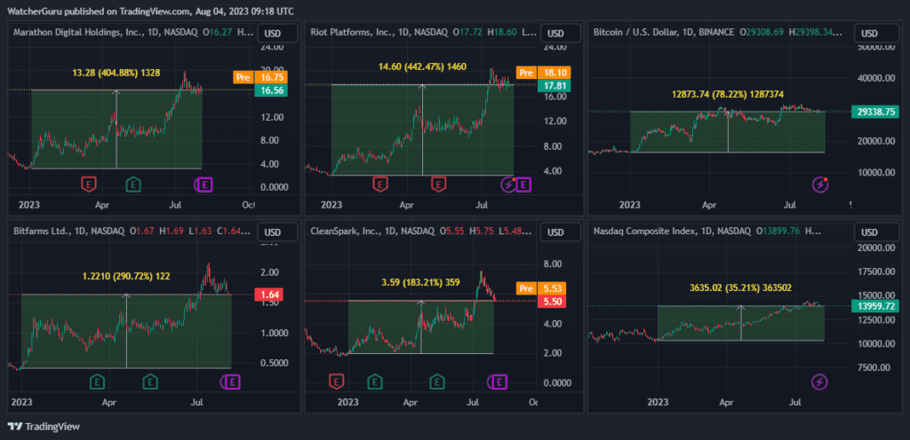 Akcje firm zajmujących się wydobyciem Bitcoina odnotowały imponujące zyski od początku 2023 roku, znacznie przewyższając zarówno samo BTC, jak i szeroki parkiet giełdowy. Największy wzrost zanotowała platforma wydobywcza Riot, która zanotowała aprecjację o 442% od minimów zarejestrowanych 3 stycznia 2023 roku, podczas gdy Marathon wzrósł o 405%. Inne firmy górnicze, takie jak CleanSpark i Bitfarm, doświadczyły wzrostu między 180% a 290%. Dla porównania, cena Bitcoina wzrosła w tym roku o 78%, podczas gdy indeks Nasdaq Composite o 35%.