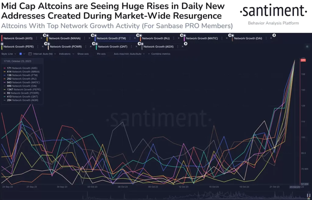 Cena Bitcoina przekraczyła magiczną granicę 35 000 USD za token, osiągając najwyższą cenę od maja 2022 r. i tegoroczne maksima. Zgodnie z cyklem przepływu kapitału w sektorze krypto powinniśmy się prędzej czy później nastawiać na rajd na altcoinach. Eksperci firmy analitycznej on-chain, Santiment, wskazali na kryptowaluty które doświadczają znacznych przyrostów aktywności sieciowej.
