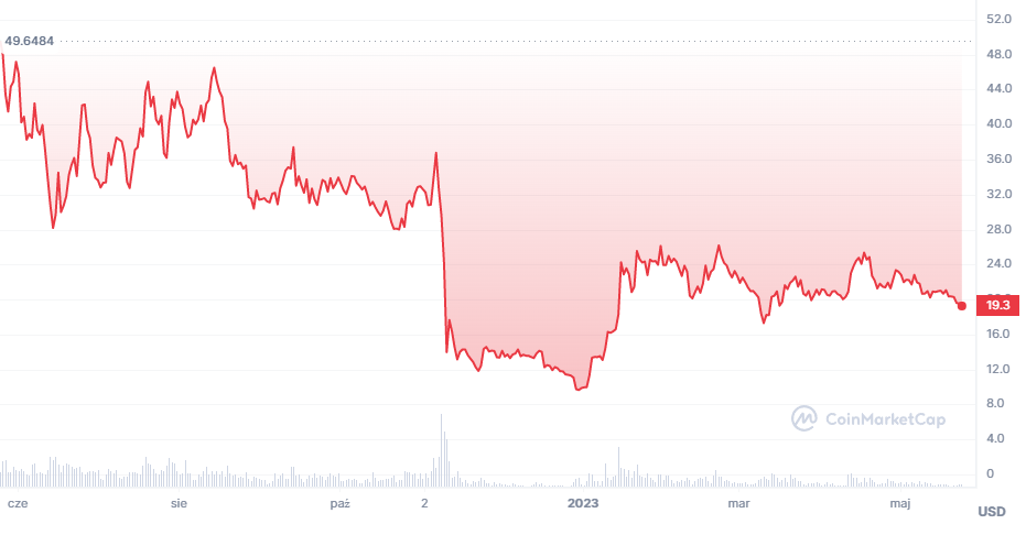 Wykrwawiają się też altcoiny. Przykładowo Solana, blockchain który notuje niedawno znaczną aktywność portfeli kryptowalutowych i przyciąga uwagę gigantów technologicznych (w przypadku NFT został dopiero co przegoniony przez absolutnie eksplodujące Bitcoin Ordinals) powróciła do swojego długoterminowego kanału spadkowego. Ekscytacja związana z wyczekiwaniem powrotów do poziomu 30 dolarów za sztukę i wyżej ustąpiła ponurej realizacji iż wracamy poniżej cen z dwójką z przodu. Najbardziej pesymistycznie wieszcze prognozują powrót choćby w rejony jednocyfrowe.