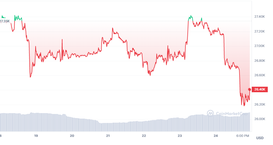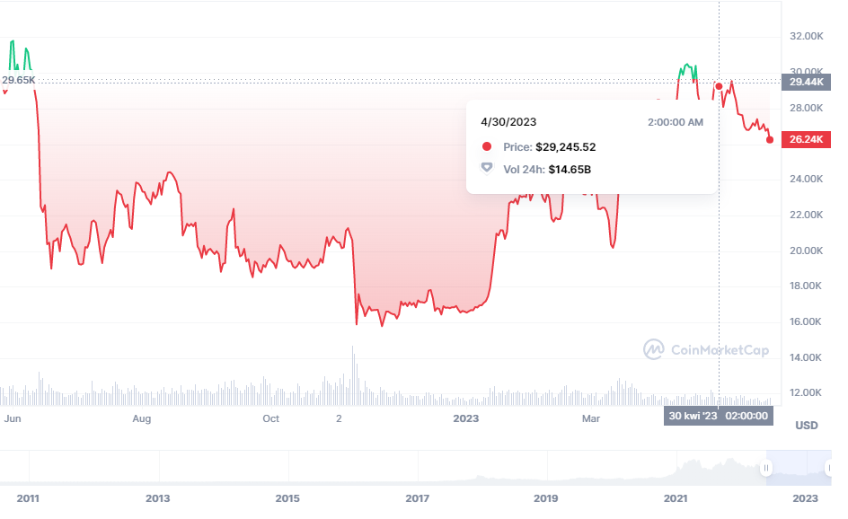 Bitcoin zanotował w ciągu ostatnich 24 godzin dwie duże fale wyprzedaży które odcisnęły swoje piętno na jego wycenie. Byczy impuls który wyprowadził jeszcze dzień-dwa dni wcześniej najstarszą kryptowalutę w rejony 27 400 USD za BTC wygasł, a pierwotny entuzjazm zamienił się w krótkoterminowy strach. Aktualna cena Bitcoina konsoliduje w rejonie 26 000 dolarów. Maj jest dotychczas najgorszym miesiącem w 2023 roku dla BTC, a wielu inwestorów przypomina, iż w majowe spadki to częste zjawisko na rynkach finansowych.