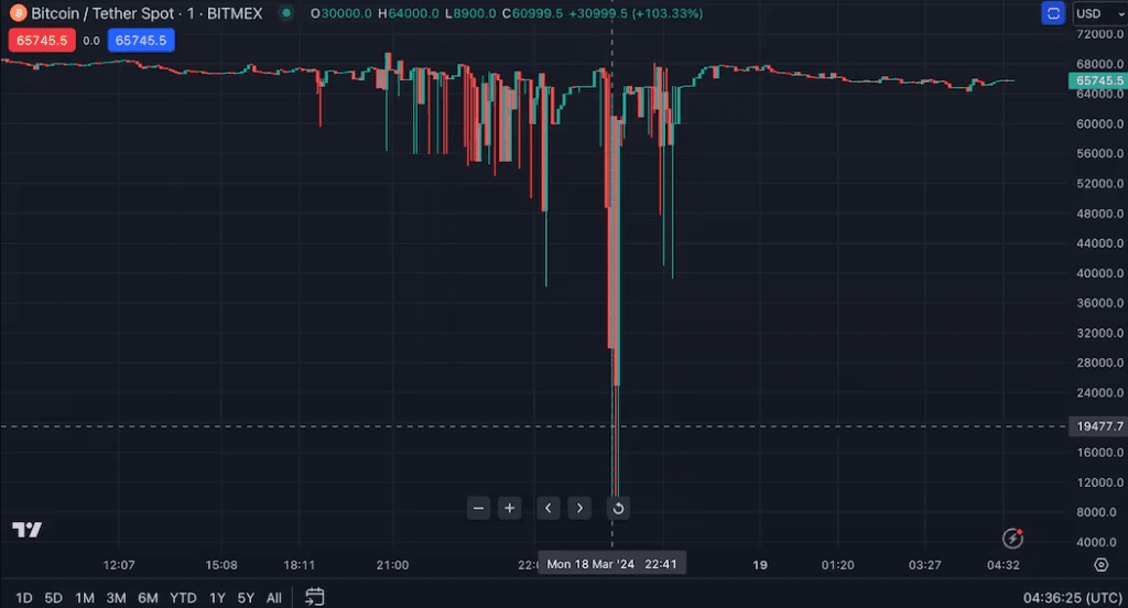 „Flash crash” rozpoczął się o godzinie 23:40 czasu polskiego i w ciągu zaledwie dwóch minut cena Bitcoina drastycznie spadła, tylko po to by za moment odbić się z powrotem do 67 000 USD 10 minut później. Spekulanci gwałtownie otrząsnęli się z koszmaru i rzucili na zakupy: globalnie średnia cena Bitcoina pozostała bowiem stabilna na poziomie około 67 400 USD w tym samym czasie.