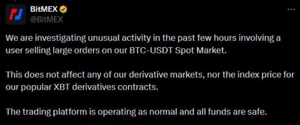 Podkreślono, iż eksplozja wpłynęła tylko na rynek spot BTC-USDT i nie miała wpływu na żadne rynki instrumentów pochodnych ani cenę indeksu dla kontraktów pochodnych XBT. „Badamy nietypową aktywność użytkownika sprzedającego duże zamówienia na naszym rynku spot BTC-USDT”, wyjaśnił przedstawiciel BitMEX, dodając, iż „wszystkie fundusze są bezpieczne, a platforma handlowa działa normalnie”.