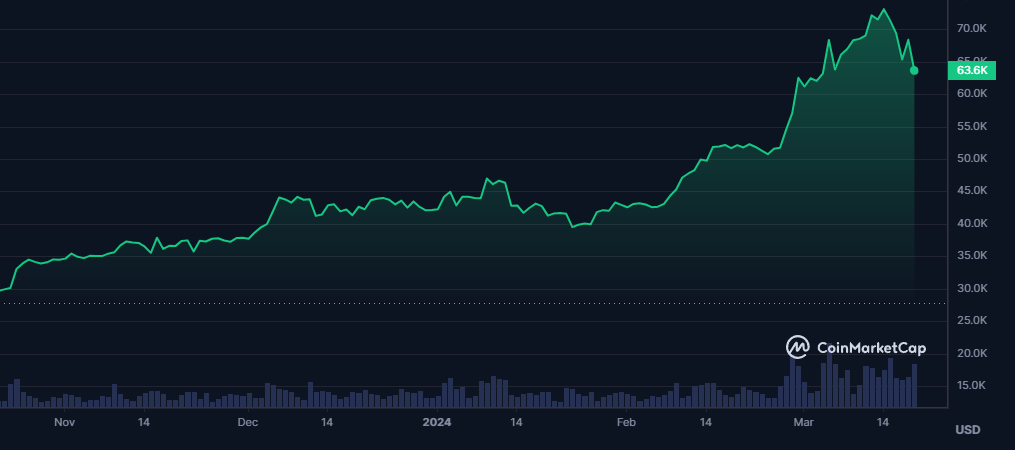 fot. BitMEXNa moment powstawania tego artykułu cena Bitcoina wynosi ok. 63-64 tys. USD za sztukę.