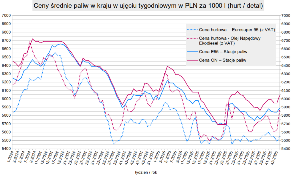 Cena diesla i benzyny w hurcie i detalu (średniotygodniowa) – wykres