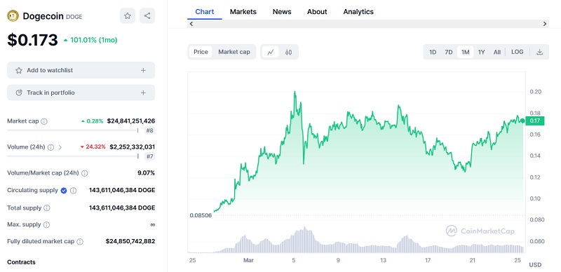 W chwili pisania artykułu cena Dogecoina wynosi 0,173 USD. W ostatnich 24 godzinach cena tokena zmieniła się tylko nieznacznie. Dużo lepiej wygląda to w okresie ostatnich 7 dni (wzrost o blisko 18%), a znakomicie w ciągu miesiąca, ponieważ w tym czasie Dogecoin podrożał o ponad 100%
