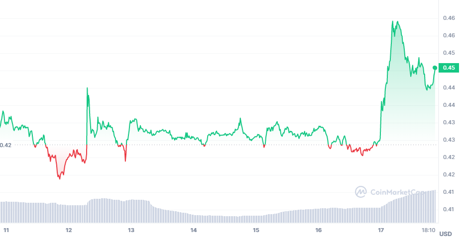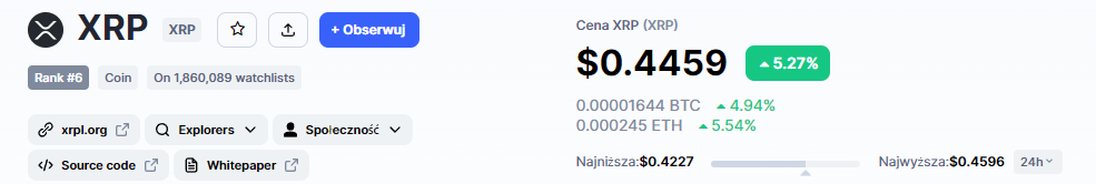 Dzisiaj (tj. 17.05.2023) tokeny XRP rozpoczęły swój byczy rajd z poziomu 0,42$ za sztukę aż do dziennych maksimów wynoszących 0,46 dolara za monetę. Stanowiło to wzrost o ok. 10%. Następnie doszło do fazy realizowania zysków, a kurs wrócił w okolice 0,44$.
