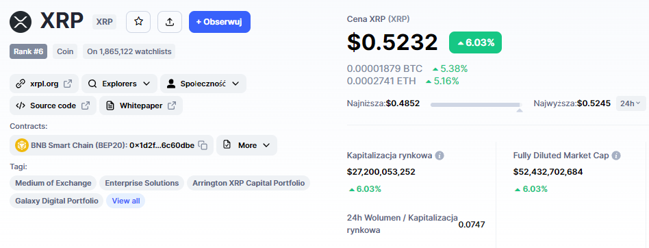 — Mr. Huber🔥🦅🔥 (@Leerzeit) May 19, 2023AKTUALIZACJA: W momencie powstawania tego tekstu cena XRP wynosi ok. 0,52 USD za sztukę. Cena rośnie o ok. 6-7%, docierając do psychologicznego poziomu oporu w rejonie 0,53-0,54 dolara za token.