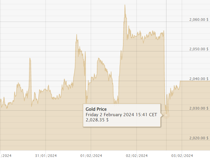Informacje te przełożyły się na sumaryczny wzrost wynagrodzeń. Pociągnęło to za sobą wzrost dolara i presję na sprzedaż kruszcu. W związku z tym, w piątek po południu cena złota osiągnęła lokalne minimum na poziomie 2028 dolarów za uncję.