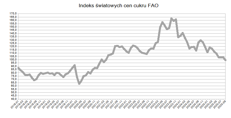 Dla porównania, w analogicznym okresie (sierpień 2024 – sierpień 2025) światowe ceny cukru spadły o 9,1 procent (Indeks FAO).