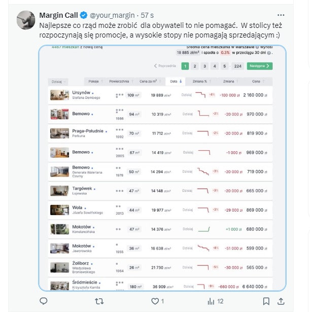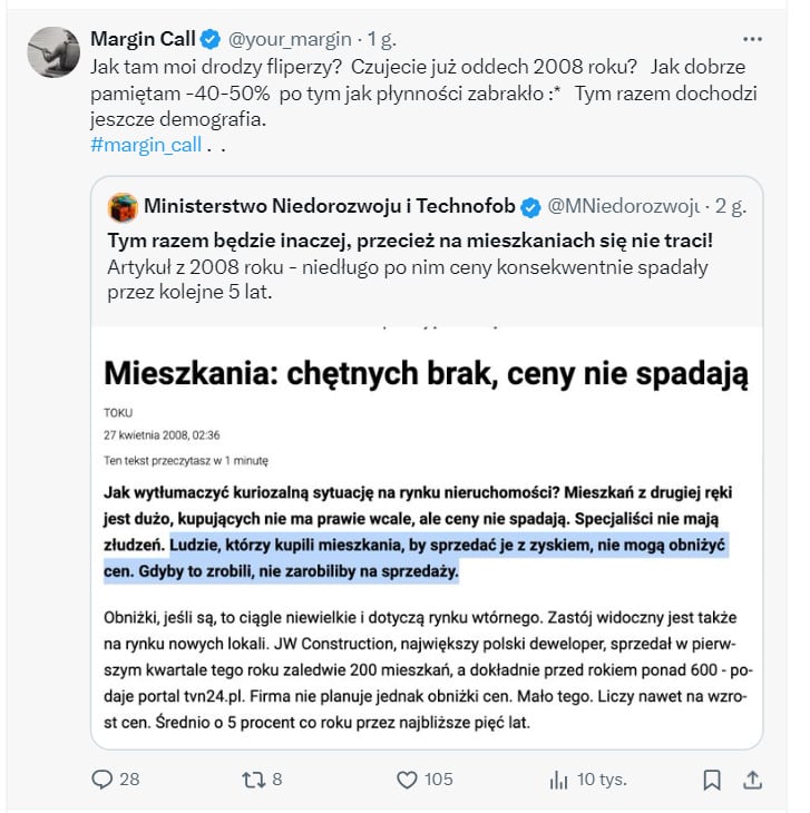 Zwłaszcza jeżeli stawiało się bloki i domy z myślą o podwojeniu wkładu. Rzeczywistość uderza jednak nie tylko do świadomości tych, którzy sprzedają, ale również do tych, którzy kupują. Konsument ma świadomość tego, iż obecna sytuacja stawia 'deweloperkę’ pod presją i coraz częściej kręci nosem, negocjuje od dolnych widełek, lub odwraca się na pięcie i szuka oferenta, który opuści cenę. Dokładnie identyczna sytuacja miała miejsce w roku 2008 – wtedy także deweloperzy trzymali się za wszelką cenę wysokich cen. Te jednak okazały się nierynkowe i niemożliwe do otrzymania. Pewne jest jedno – ceny w Polsce zaczynają spadać.