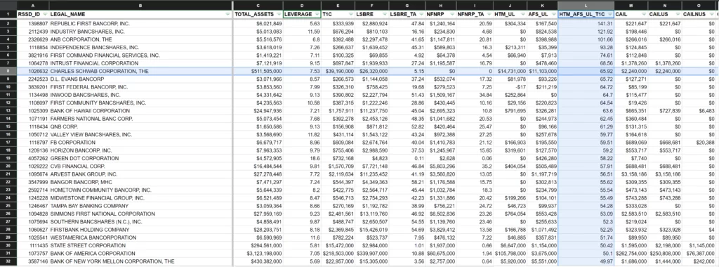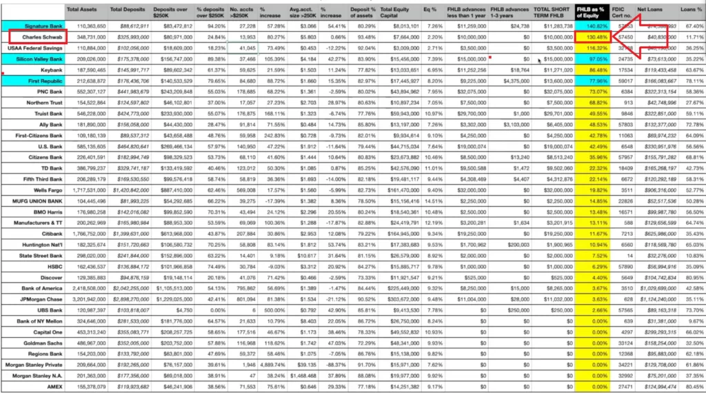 Charles Schwab ponad 130% całkowitego kapitału własnego zawdzięcza pożyczkom Federal Home Loan Bank (FHLB). Te (jak mówią plotki) mają niebawem zostać spłacone. Łączne aktywa firmy wynoszą 350 miliardów dolarów. FHLB to system federalnej pomocy bankowej dla kredytów nieruchomościowych. Zbudowany jest przez 11 federalnych banków sponsorowanych przez rząd Stanów Zjednoczonych. Instytucje te zapewniają płynność członkom instytucji finansowych. Cel? Ws[arcie finansowania mieszkaniowego i inwestycji społecznych. Zapożyczanie się w nich nigdy nie było tanie, a odsetki rosną wraz ze wzrostem stóp procentowych.