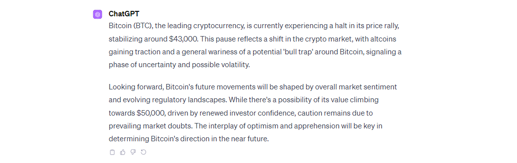 Pomimo obecnej przerwy w rajdzie, cena Bitcoina (BTC) pozostaje krytycznym wskaźnikiem ogólnej kondycji rynku. Jak wskazuje ChatGPT, jego stabilność wokół poziomu 43 000 USD sugeruje fazę konsolidacji, która może poprzedzać wybicie lub korektę, co podziela wielu ekspertów rynkowych.