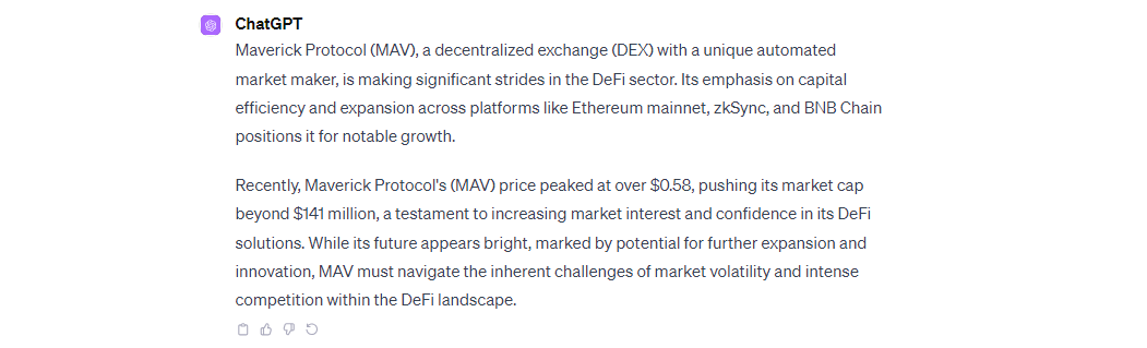 Maverick Protocol (MAV), zdecentralizowana giełda (DEX) zasilana przez innowacyjnego automatycznego animatora rynku, zyskuje na popularności w przestrzeni DeFi. Koncentrując się na efektywności kapitałowej i niedawnej ekspansji na sieć główną Ethereum, zkSync i BNB Chain, Maverick Protocol (MAV) jest nastawiony na wzrost, trend obserwowany i analizowany przez ChatGPT.