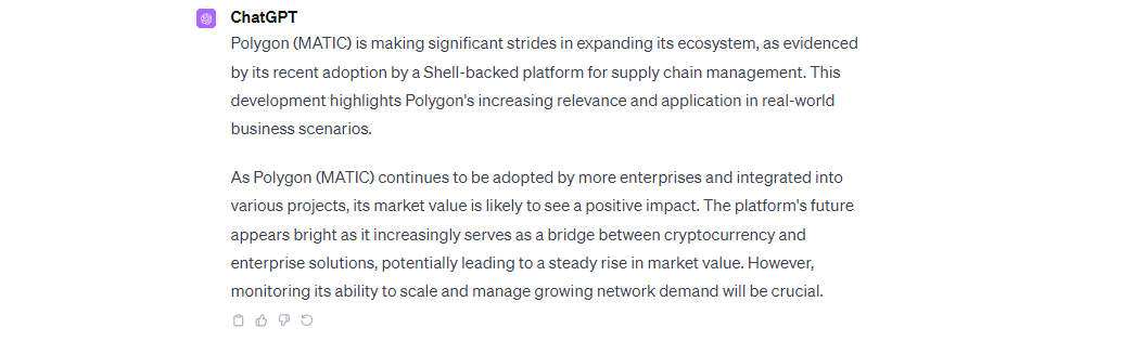 Rosnąca popularność Polygon (MATIC) i rozszerzające się przypadki użycia prawdopodobnie pozytywnie wpłyną na jego wartość rynkową. Ponieważ coraz więcej przedsiębiorstw i projektów wykorzystuje technologię Polygon, cena Polygon (MATIC) może zobaczyć trajektorię wzrostową, potencjalny wynik sugerowany przez analizę ChatGPT.