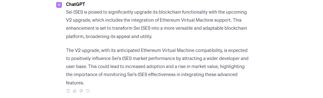 Sei (SEI) ma zwiększyć swoje możliwości blockchain dzięki dodaniu obsługi Ethereum Virtual Machine w aktualizacji V2. Rozwój ten pozycjonuje Sei (SEI) jako wszechstronną i elastyczną platformę blockchain, perspektywę wspieraną przez analizę trendów blockchain ChatGPT.
